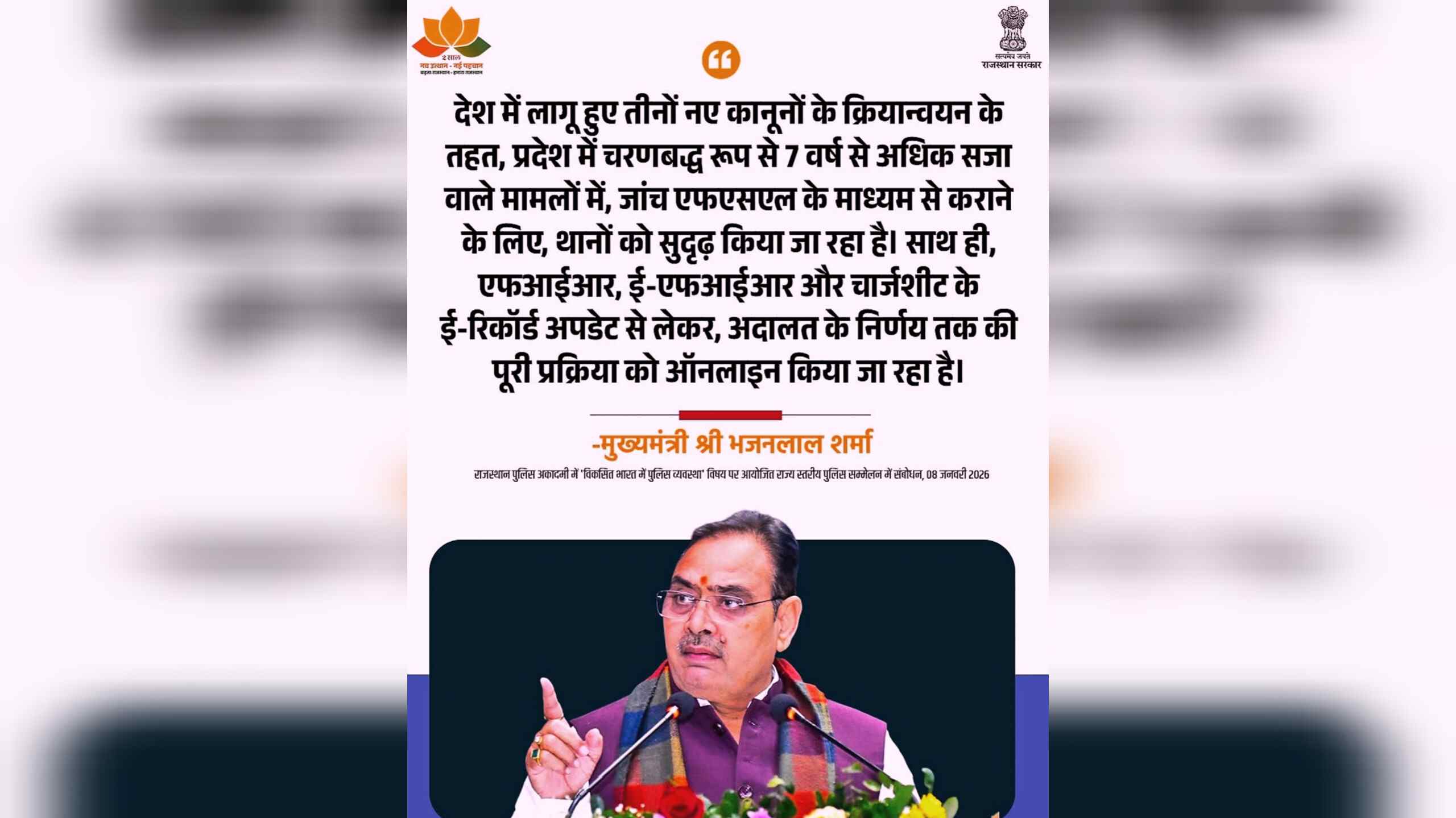 मुख्यमंत्री श्री भजनलाल शर्मा ने ये विचार राजस्थान पुलिस अकादमी में ‘विकसित भारत में पुलिस व्यवस्था’ विषय पर आयोजित राज्य स्तरीय पुलिस सम्मेलन को संबोधित करते हुए व्यक्त किए। उन्होंने कहा कि नए आपराधिक कानून न्याय व्यवस्था में ऐतिहासिक सुधार हैं और राजस्थान सरकार इनके प्रभावी क्रियान्वयन के लिए पूरी तरह प्रतिबद्ध है।